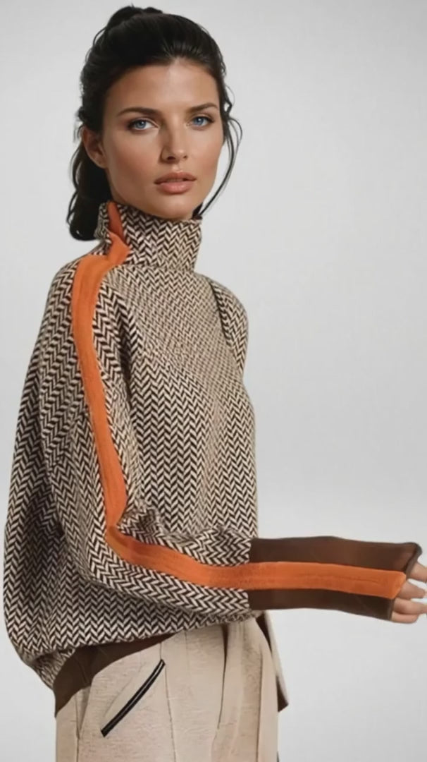 La fusión perfecta entre la sofisticación clásica y la energía contemporánea. El Suéter Siena combina un diseño geométrico en tonos tierra con una línea naranja vibrante que aporta carácter y modernidad. Su cuello alto y el corte relajado lo convierten en la prenda ideal para destacar sin esfuerzo, tanto en tus días más tranquilos como en los más dinámicos.